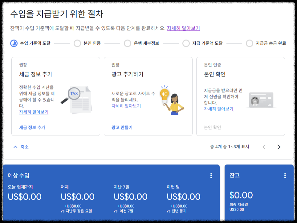 애드센스 홈에서 수익을 지급받기 위해서는 세금 정보 추가가 필수입니다.